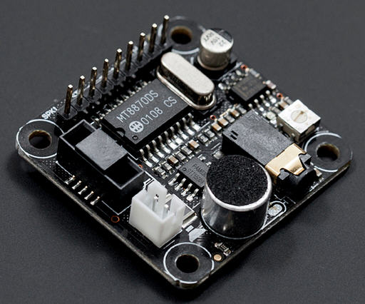This board is a Dual-tone multi-frequency signaling module decoder for Arduino and gadgeteer. With its audio connector you can decode the crazy funny noises common phones make. If you are not sure what Im talking about, imagine a home phone while pressing several of its keys. These Touch-Tones have a specific frequency or sound that this module can decode.