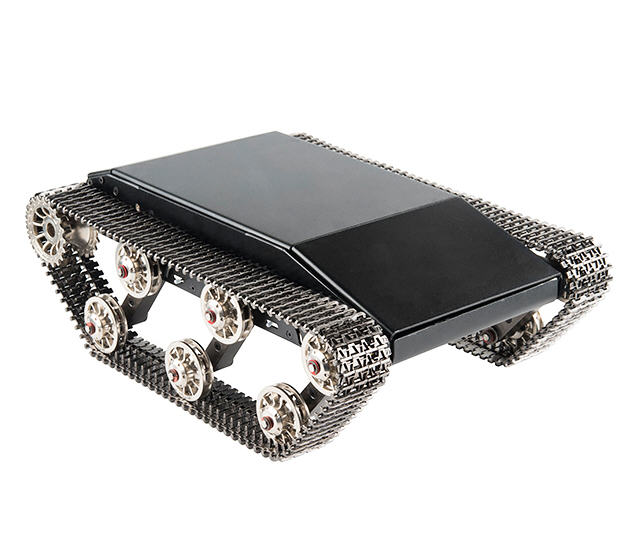 The TRex Tank Chassis is equipped with two independently driven 12V gearmotors with a typical current rating of 4A (No Load at 1.3A & Stall Current at 11A with a 5000mAh LiPo Battery). Each motor drives one tank tread that offers three lower wheels that help to improve traction and reduce shock to the main body and controller. On that note: the gears, tracks, suspension struts, and wheels are all made of die cast zinc which offers a fair amount of corrosion resistance reducing the constant need of maintenance and upkeep.